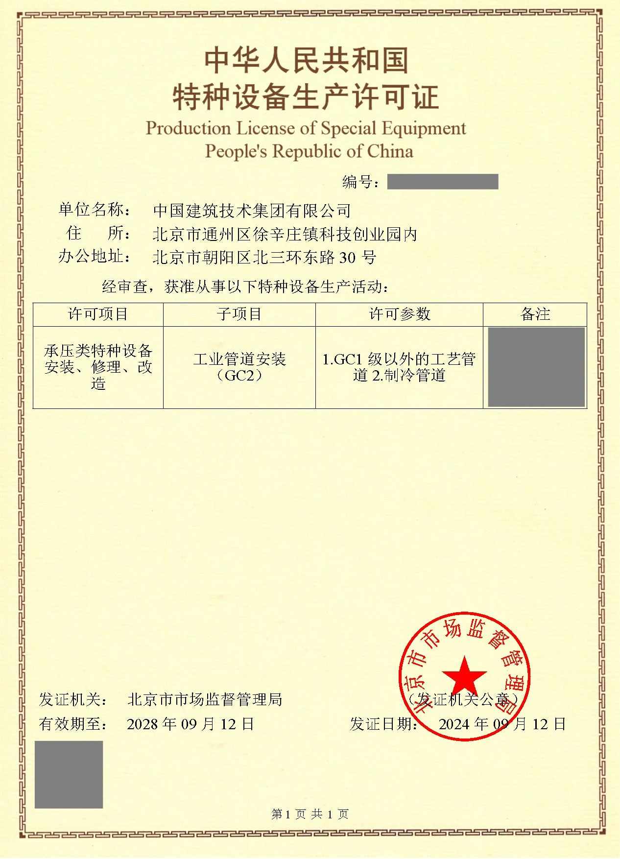 9月12日,经北京市市场监督管理局审核通过,3044永利集团官网成功取得“特种设备(GC2级工业管道安装)生产许可证”。工业管道安装(GC2级)生产许可证主要适用于承压类特种设备的安装、修理和改造。