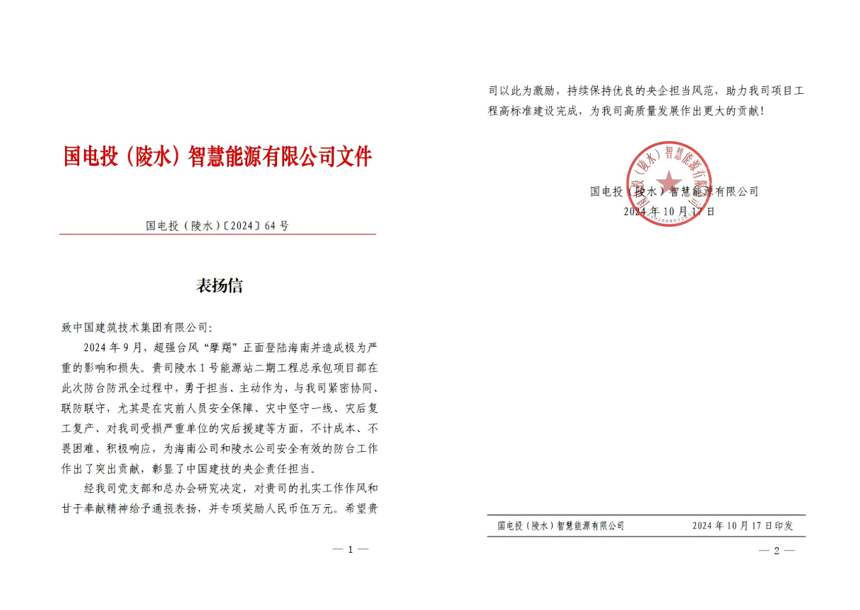 在9月“摩羯”台风自然灾害突袭下,项目部积极担当、善作善为。在保护好所有参建人员人身安全前提下,全力维护甲方既有财产和施工现场不受损失,并在灾后第一时间,抽调项目主力,参与社会救援。此举深受当地政府和建设单位赞许,业主给予通报表彰和现金奖励。
