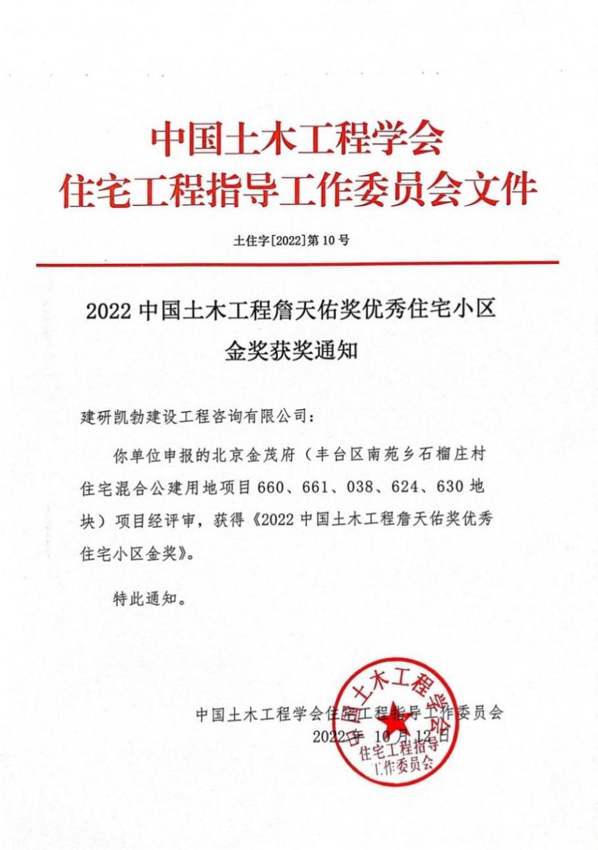 近日,中国土木工程学会住宅工程指导工作委员会公布了“2022中国土木工程詹天佑奖优秀住宅小区金奖”评选结果,建研凯勃公司监理的“北京金茂府(丰台区南苑乡石榴庄村住宅混合公建用地项目660、661、038、624、630地块)”工程荣获“2022中国土木工程詹天佑奖优秀住宅小区金奖”。