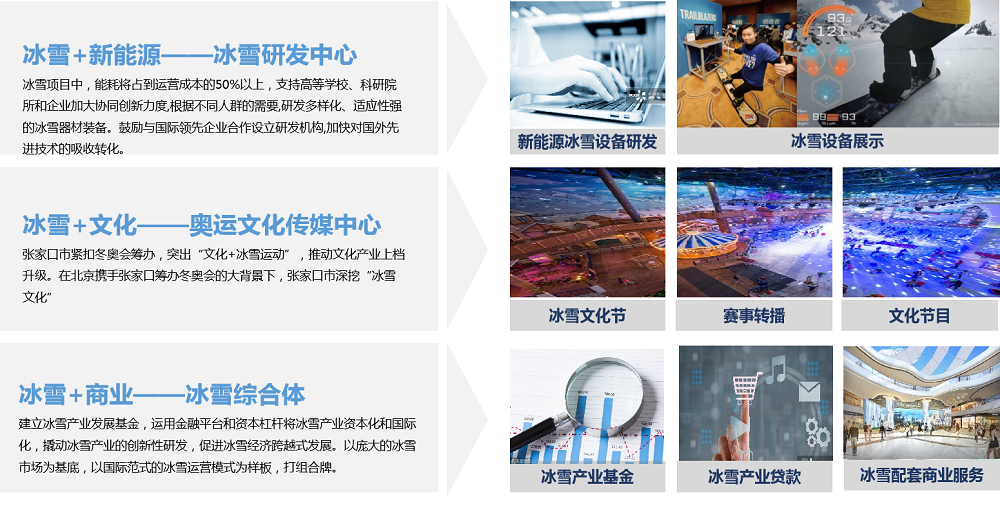冰雪体育产业协同——依托“奥运+”,发展冰雪体育产业,提升赛事综合效益,发展“冰雪+”产业重点项目。与特色产业结合发展,打造“一地一品”“一地多品”的特色冰雪产业。